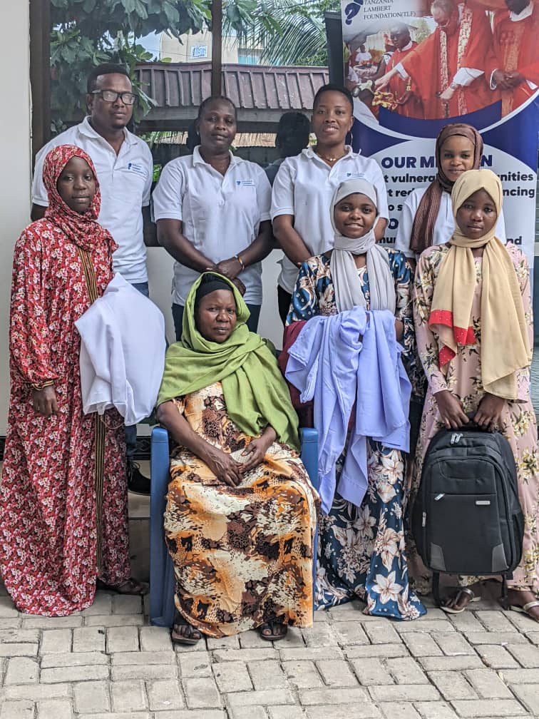 Katika picha ya pamoja Timu ya T.L.F na Mabinti watatu kutoka kushoto Sophia, Mwajuma,na aliyeshika begi Hanifa pamoja na Mlezi wao Bi. Khadija kutoka kituo cha watoto wahitaji MAUNGA katika ofisi za Tanzania Lambert Foundation ( TLF) Kinondoni jijini Dar- es -Salaam.